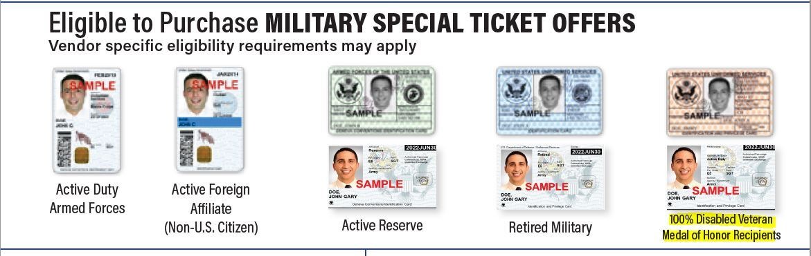 - All tickets are privileged Military discounted regardless of ticket type. All tickets given to anyone not being the Military ID Holder, is considered the sponsored guest regardless of the ticket type. Any misuse of any Military ticket type ties back into the purchasing member’s ID. It is up to the authorized Military Purchaser to ensure all sponsored guest understand the policies of the ticket they are using.
